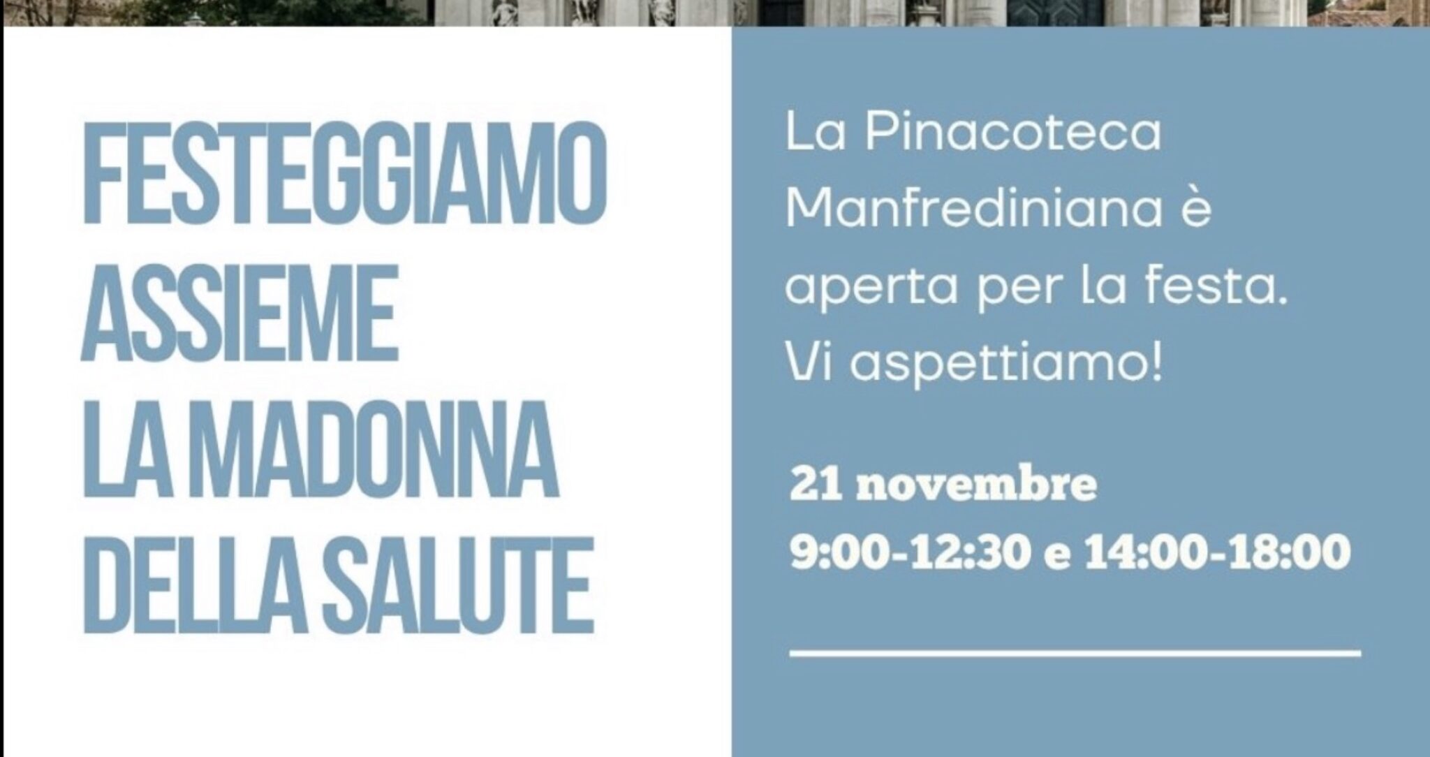 In occasione della festa della Madonna della Salute del 21 novembre, la Pinacoteca Manfrediniana apre le sue porte a tutti i visitatori. Saremo aperti con orario 9:00-12:30 e 14:00-18:00. Vi aspettiamo.